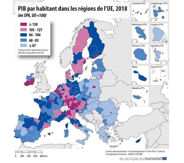 En 2018, le PIB par habitant dans les différentes régions européennes variait de 30% à 263% par rapport à la moyenne européenne (30.200 euros) selon de récents chiffres d’Eurostat.
